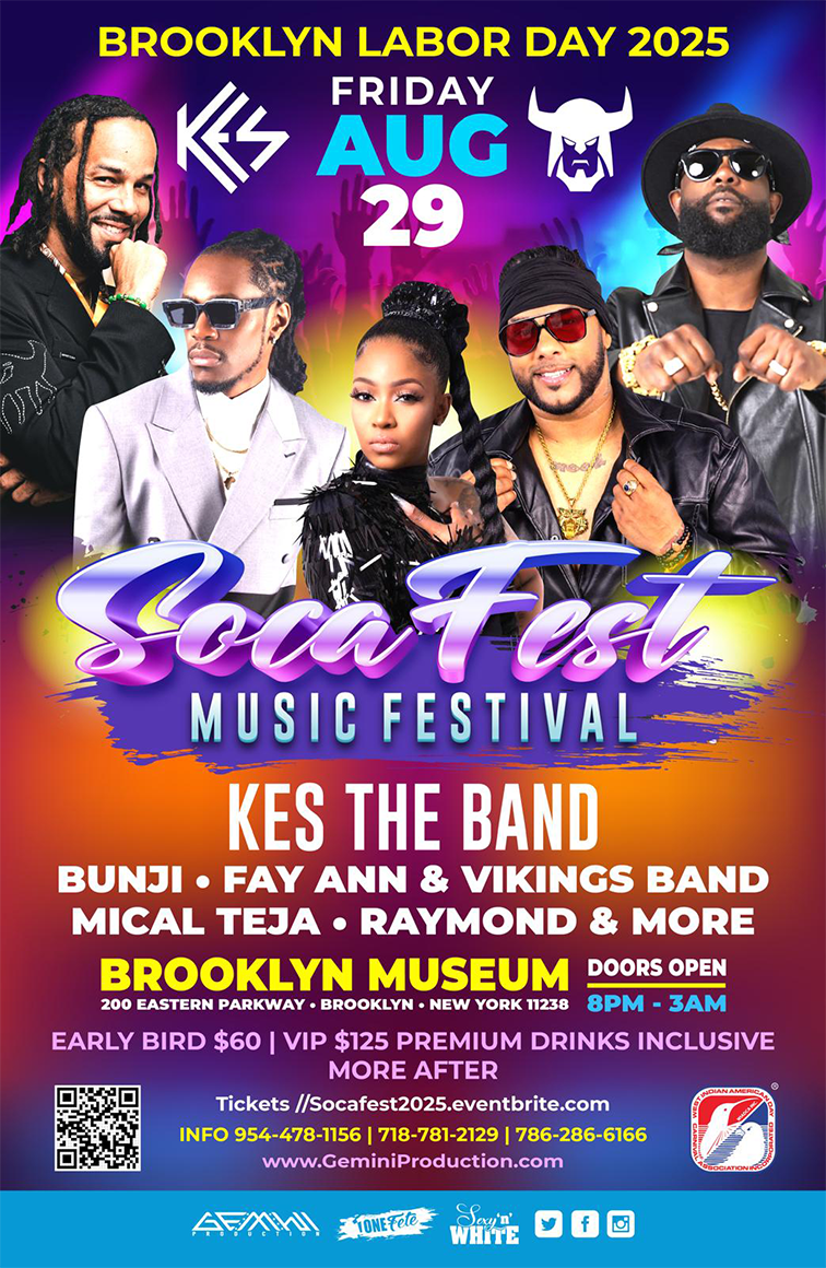 Brooklyn Labor Day Friday Gemini Production Presents SOCA FEST: The Music Festival Get ready for the ultimate Soca experience featuring an all-star lineup, including: π€ Kes the Band | π€ Bunji Garlin & Fayann Lyons with the Vikings Band | π€ Mical Teja | π€ Raymond Ramnarine ...and many more! π Brooklyn Museum, 200 Eastern Parkway, Brooklyn, NY π Friday, August 29, 2025 | π Doors Open: 8:00 PM | Event Ends: 3:00 AM | Early Bird Tickets: $60 | VIP: $125 (Premium drinks included) | Prices increase after early bird tickets sell out. For tickets and more information, contact: π 954-478-1156 | 718-781-2129 | 786-286-6166. Don't miss the biggest Soca event of the season β pure vibes, nonstop energy, and unforgettable performances!